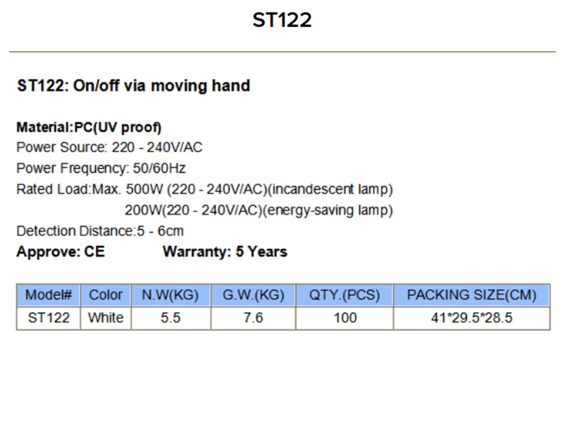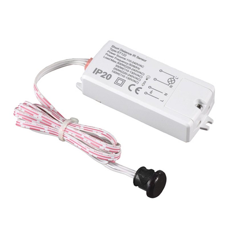 Инфрачервеният сензор за близост, max 200 W LED, 230V отчита движение в много малък обхват – 5-6 cm. Задейства се с махване на ръка и е подходящ за вграждане на места, които човек лесно може да достигне с ръка: кухненски шкафове, детски стаи; както и там, където по хигиенни съображения е препоръчително ключът за осветлението да не се докосва.