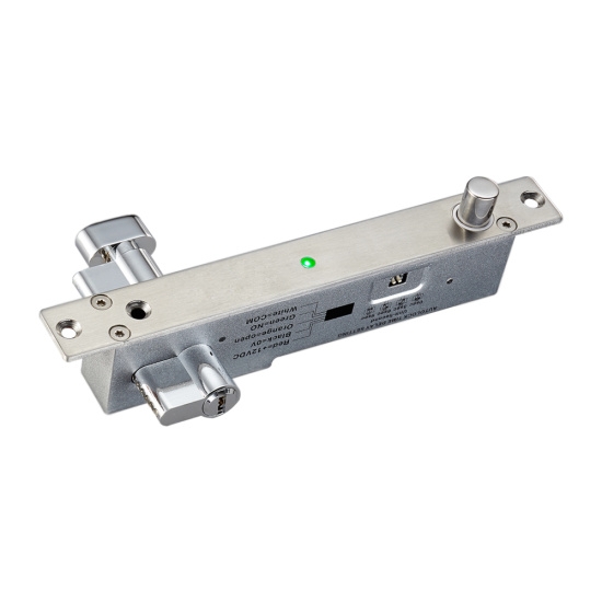 Соленоидна брава за вграждане (Fale Secure) с вграден стандартен DIN патрон и комплект ключове. Тесен профил. Предназначена за тежки, метални, дървени и пожарни врати. LED индикация и сигнал за състояние на вратата NC/COM. Захраване 12VDC, пикова консумация 960 mA. Автоматично заключване след 0, 3, 6, 9 sec. Размери 210 x 25 x 42 mm