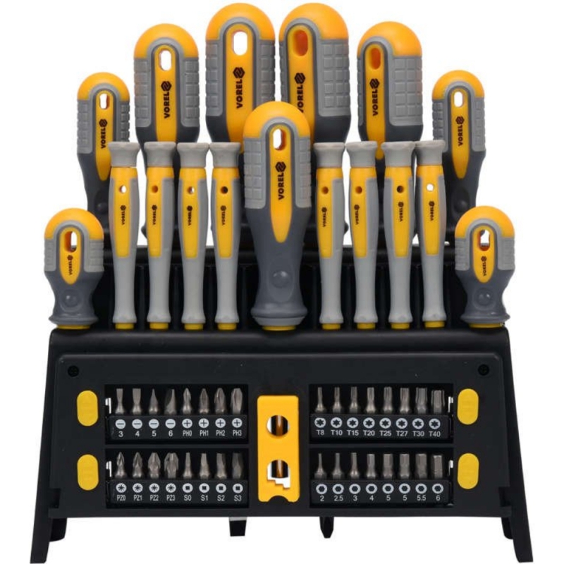Комплект битове и отвертки, изработени от висококачествени материали. Широката гама от размери гарантира гъвкаво използване и възможност за достигане на труднодостъпни места.