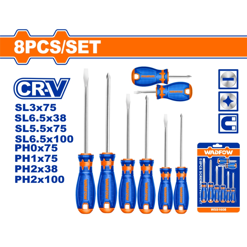 Комплект отвертки, намагнетизирани, WADFOW, Crv, SL, PH, 8 части