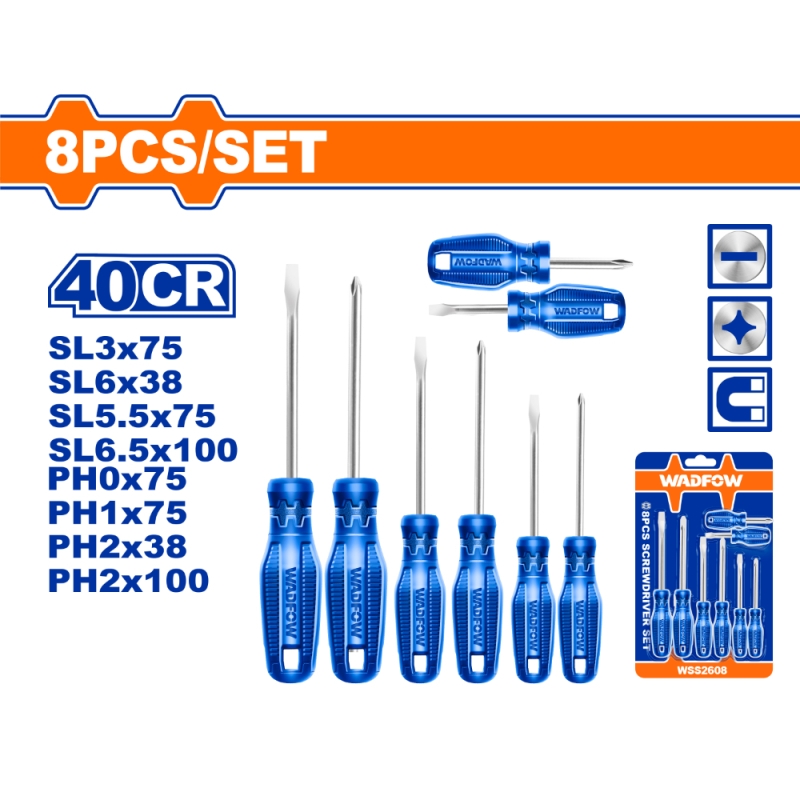 Комплект отвертки, намагнитизирани, WADFOW, SL, PH, 8 части