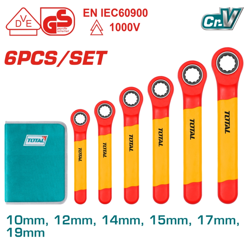 Комплект изолирани тресчотни ключове VDE, TOTAL INDUSTRIAL, 10 - 19 мм, 6 части